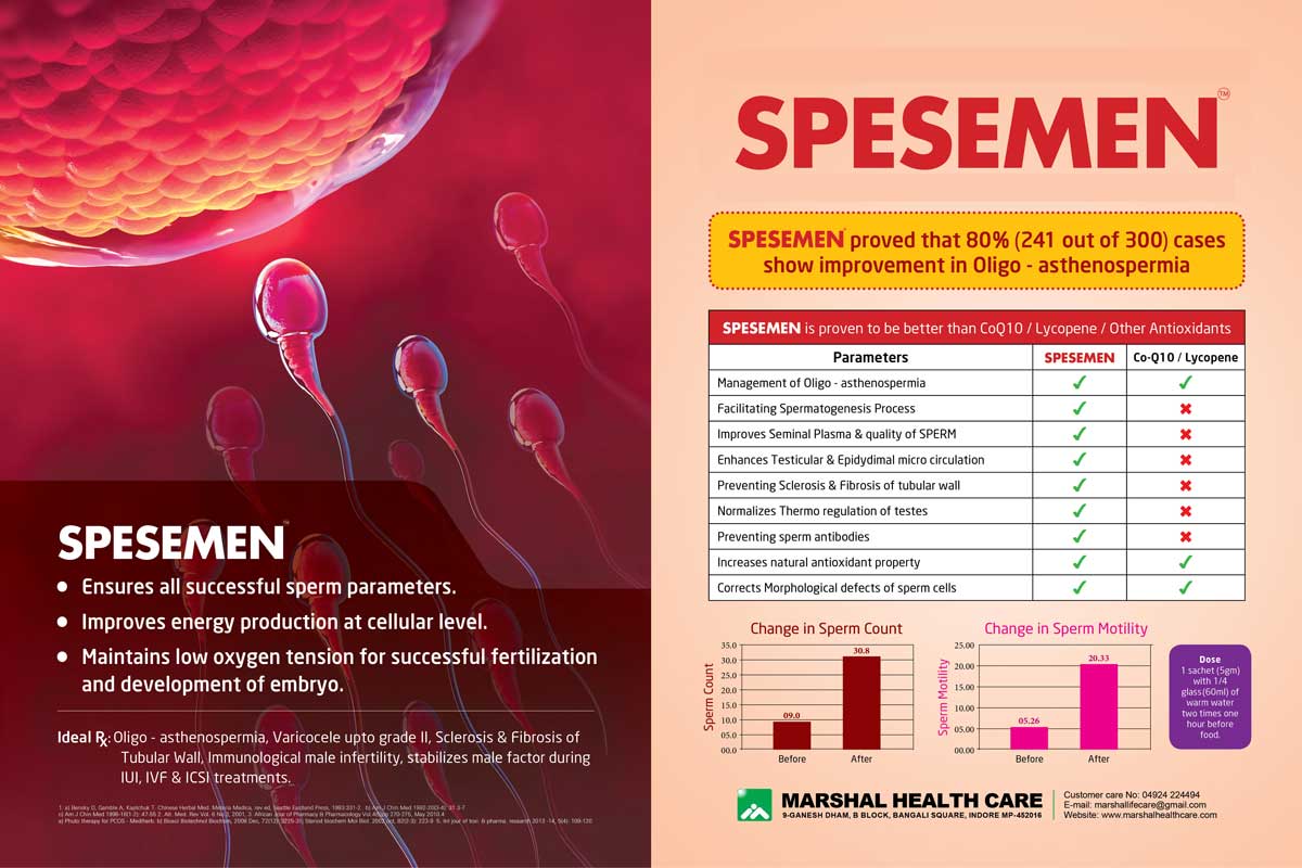 Oligo- asthenospermia is a common now a days this condition is a finding in semen analysis, which leads to the condition of male infertility 40 % of infertility cases. Getting effective result in modern medicine in this conditions are challenging, so many drugs are under trail in modern medicine also. The effective combination of SPESEMEN will help the patients with infertility problem of reproductive age. SPESEMEN improve the parameters described in WHO in semen analysis, sperms are produced in tests and motility is attained in epiddims and by the action of a accessory glands, so we are used the combination which act on testes and also at accessory glands. The selection of ingredient of SPESEMEN depend on the basis of this criteria. CAUSES:-Modern life style in food and habits produce some fertility problems, infection like mumps, varicocile, smoking, severe alcoholism hormonal problems, unhealthy life style are the causes of oligo-asthenospermia. TREAT MENT:- SPESEMEN combination selected based on its effective action in modern era.pre and post evaluation cases showed the effectiveness of SPESEMEN combination. Significant result in the sperm count & motility after completion of the treatment. DISCUSSION:-By the completion of treatment we can see there is a remarkable improvement in sperm count & motility. This effect is may be to the ideal selection of SPESEMEN and its effective combination. These foods may have action in testes and also in accessory glands. The SPESEMEN have action in reproductive system. The dose required only 10 grams due to the process involved in preparation. The drug has action in other semen analysis parameters like increasing volume, controlling infection & normalizing liquefaction time. This foods has an peculiar action to make conception may be due to its action of acrosome of sperm cell by giving fast penetrating to ovum, SPESEMEN will also give a good health feeling in daily life due to the anti oxidant property of SPESEMEN like amalaki &mental relaxation b food like aswagandha. The excellent result of this combination of SPESEMEN may be due to the selection of foods wih different rasas but with common vrushya property. SUMMAR:- A BABY is the connecting link between two different families after marriage so infertility is a familial and social issue now a days, conception is a task after marriage. It is being a social problem than a disease, couples are mentally disabled by this infertility problems. 40% of the reasons are related to males and all modern treatments like IUI & ICSI are mostly invented to solve the male factors so an ideal food will contribute and help patients to solve their problems effectively The product of SPESEMEN is a good choice and it will help the Doctors by giving the excellent results. It will be a gift to infertile couples to relieve from their personal grieves and living them like normal couples.